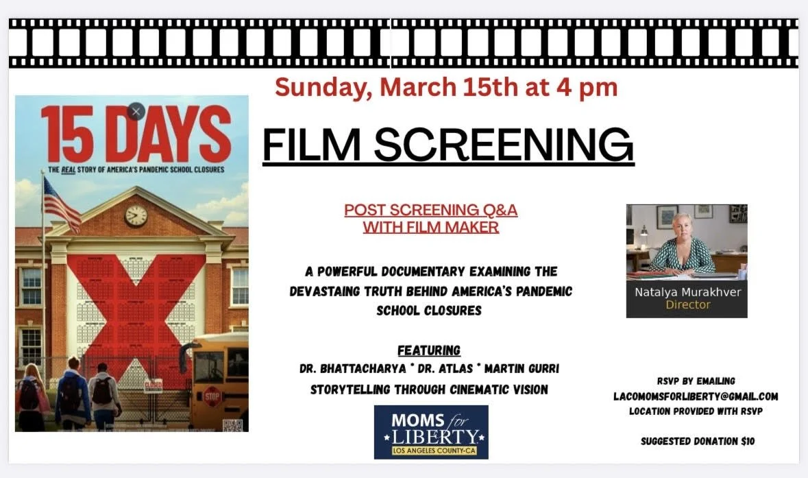 This is a one-time screening...don't miss! Sunday, March 15 @ 4 PM. To RSVP and receive location details (in Newhall), send an email to LACoMomsforLiberty@gmail.com. Suggested donation at the door, $10.