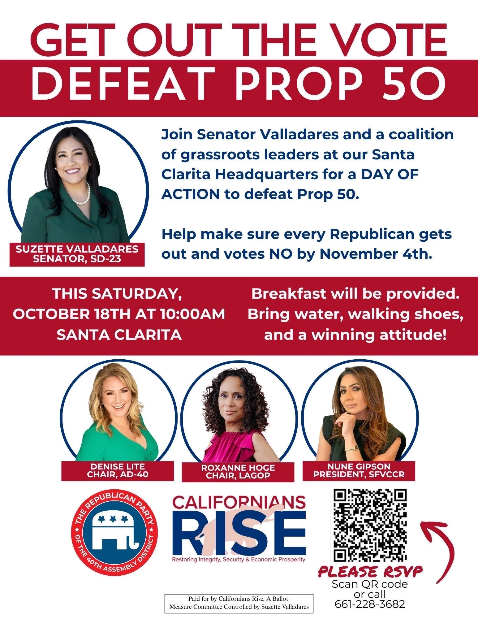 AD 40 GOTV: No on Prop 50 Saturday, October 18, 2025 10:00 AM 2:00 PM Santa Clarita, CA (map) Google Calendar ICS RSVP HERE