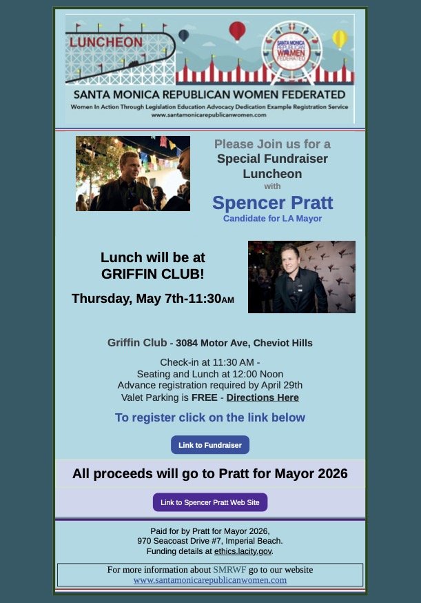 SMRWF -Welcome Spencer Pratt, Candidate for LA Mayor Thursday, May 7, 2026 11:30 AM 1:00 PM Google Calendar ICS For mor information: CLICK HERE