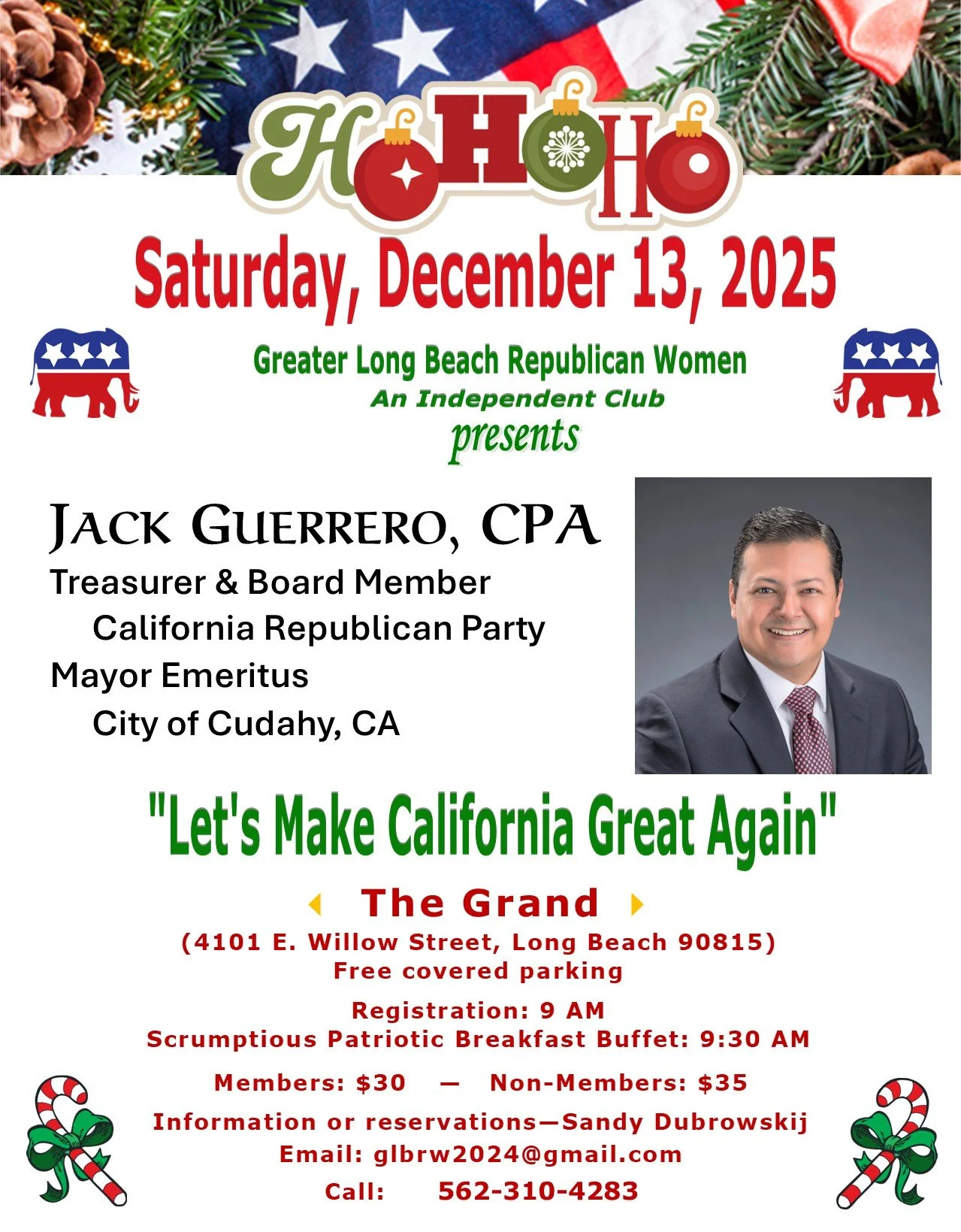 Back to All Events Greater Long Beach Republican Women Saturday, December 13, 2025 9:30 AM 11:30 AM Google Calendar ICS