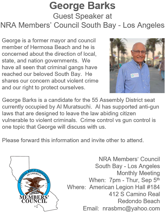 This month’s meeting will feature George Barks, former mayor and council member of Hermosa Beach, who is currently running against Assembly District 66 incumbent Al Muratsuchi. Muratsuchi has been a strong supporter of restrictive gun control measures. George will discuss his campaign and how supporters can get involved in the effort to counter these anti-gun policies.