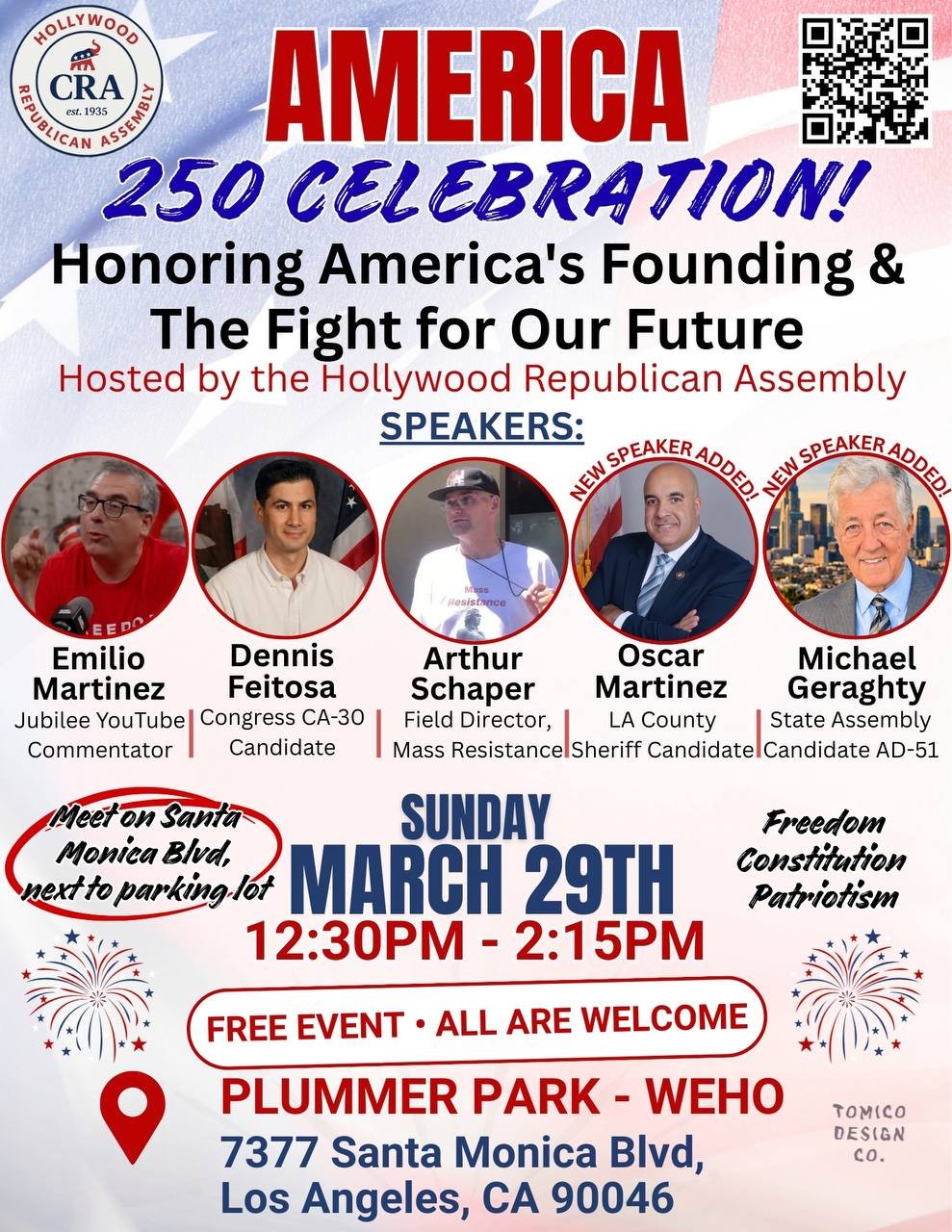 Back to All Events Hollywood CRA America 250 Celebration! Sunday, March 29, 2026 12:30 PM 2:30 PM Plumber Park 7377 Santa Monica Boulevard Los Angeles, CA, 90046 United States (map) Google Calendar ICS