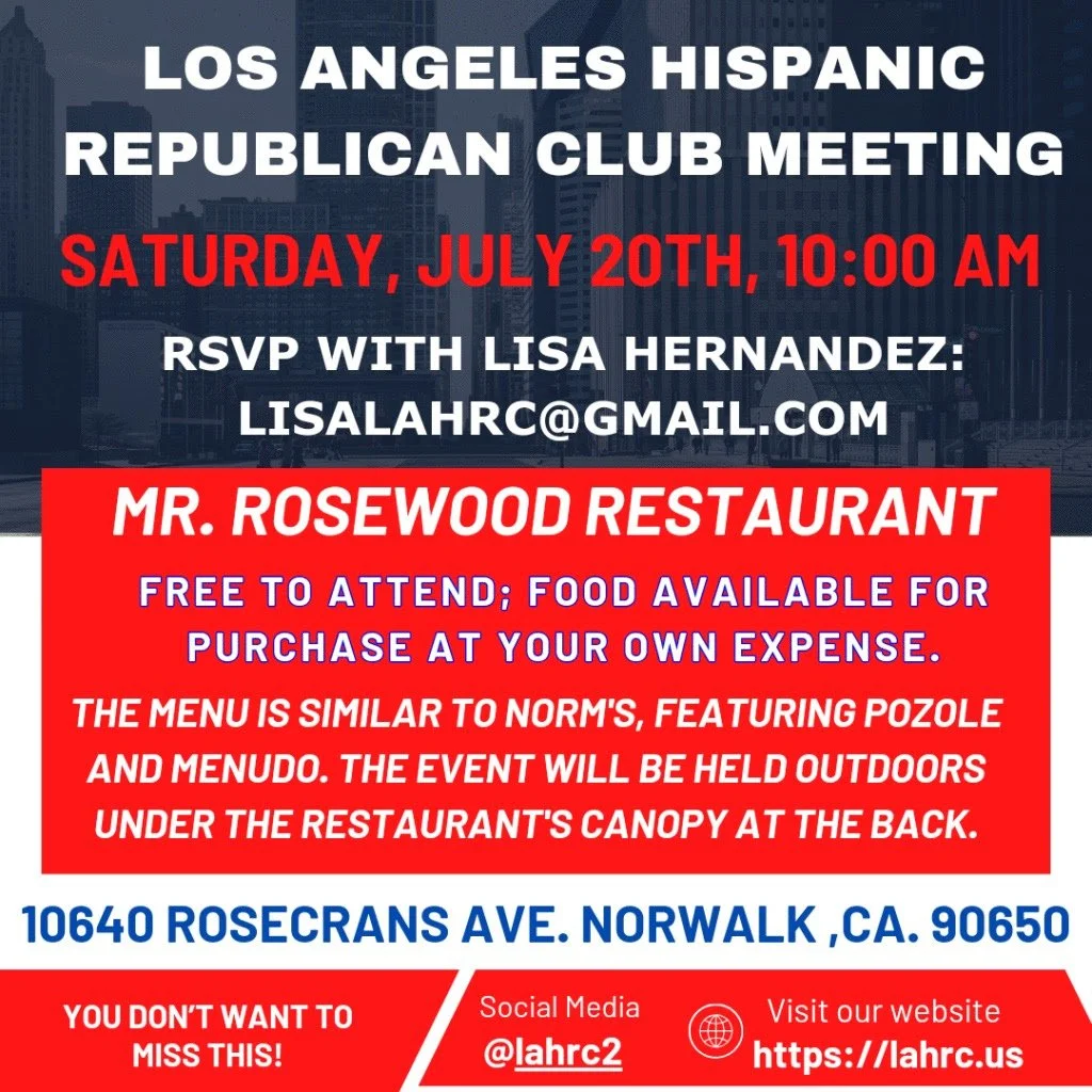 You are invited to a Los Angeles Hispanic Republican meeting! Please RSVP to lisalahrc@gmail.com.