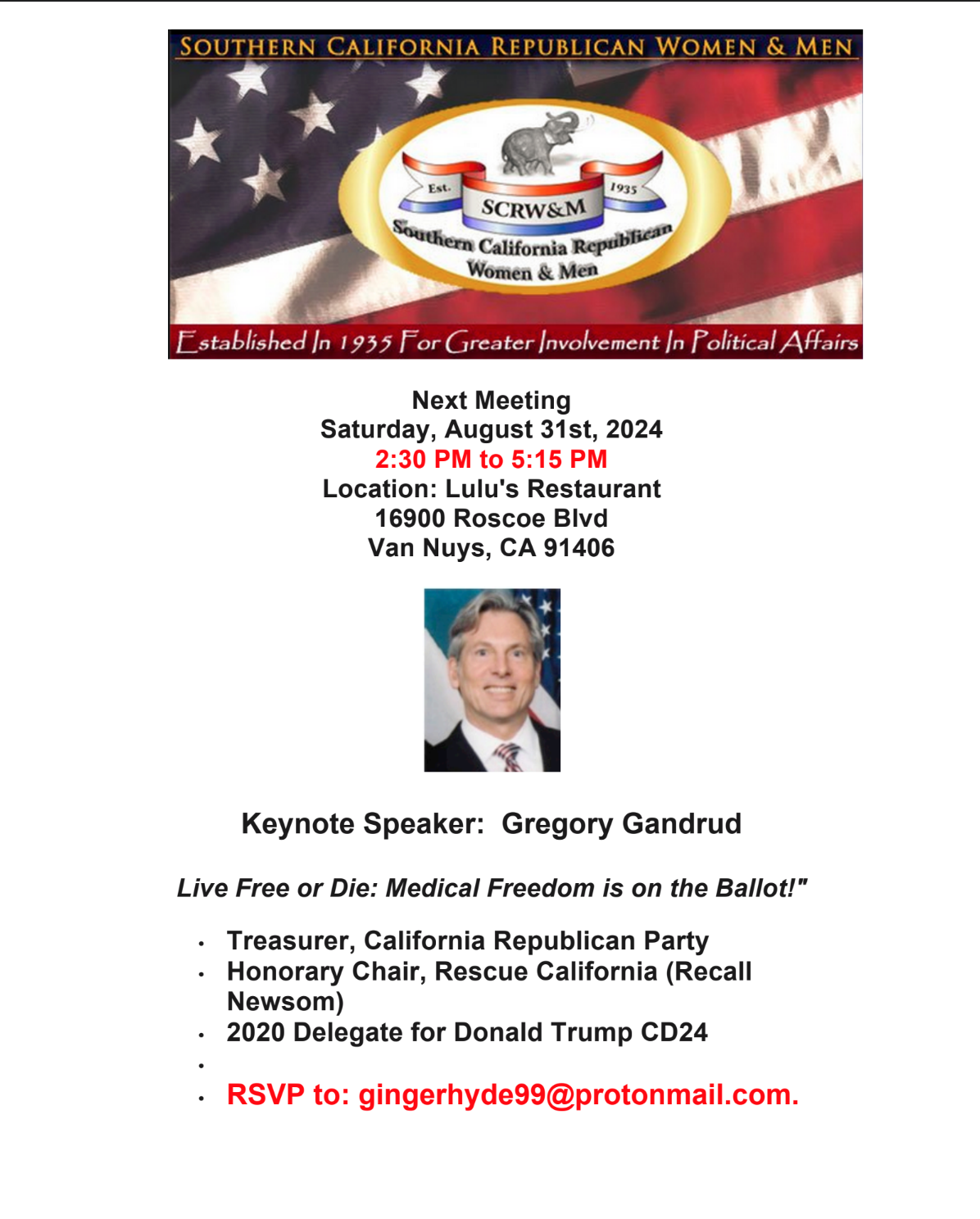 Live Free or Die: Medical Freedom is on the Ballot! Saturday, August 31, 2024 11:30 AM 2:15 PM Google Calendar ICS Join the Southern California Republican Women & Men at their next meeting. Guest speaker, Gregory Gandrud, will be talking about the importance of voting and how we have to fight for our medical freedom.Please RSVP to gingerhyde99@protonmail.com.