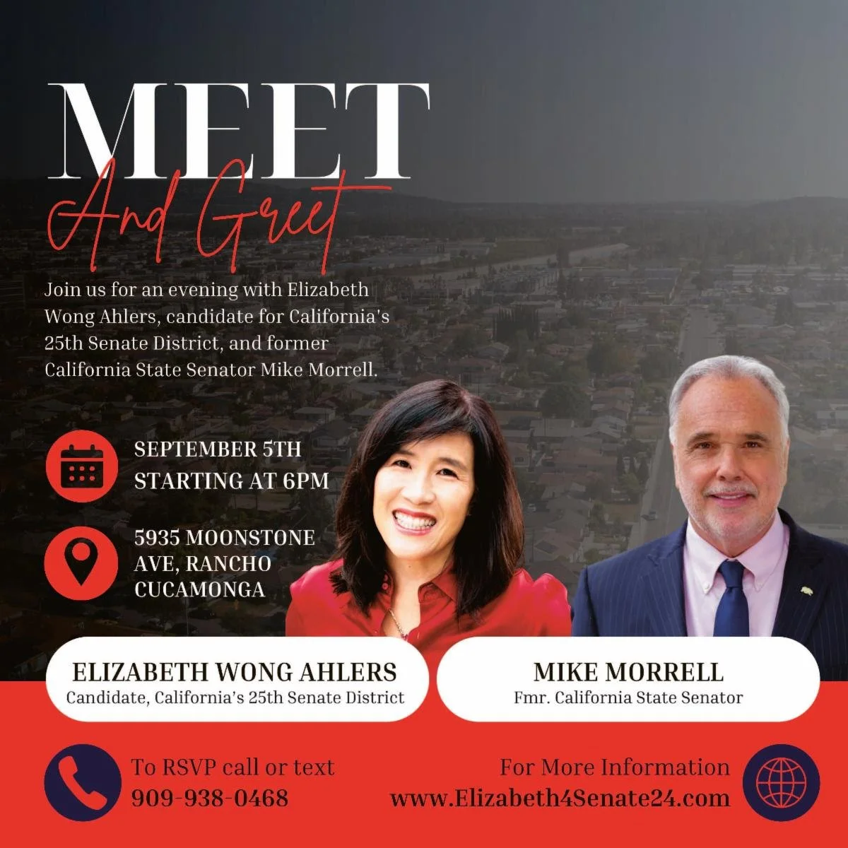Meet and Greet for Candidate Elizabeth Wong Ahlers Thursday, September 5, 2024 3:00 PM 4:10 PM 5935 Moonstone Avenue Rancho Cucamonga, CA, 91701 United States (map) Google Calendar ICS