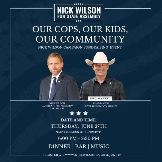 Nick Wilson is running for state assembly and would love your support! Please join him at his fundraising event on June 27th. The event will consist of dinner, music, and a bar. Special guest, Chad Bianco, the Riverside County Sheriff, will also attend!
