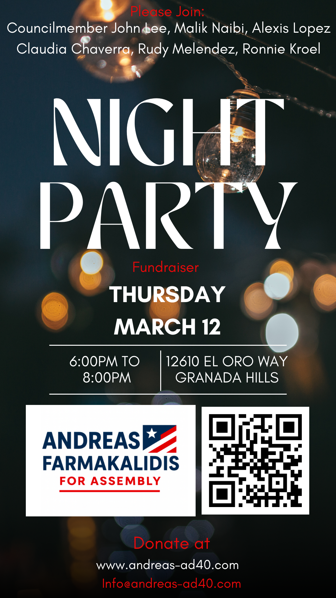 You are invited to join us for a special evening supporting Andreas Farmakalidis for California State Assembly (AD-40).