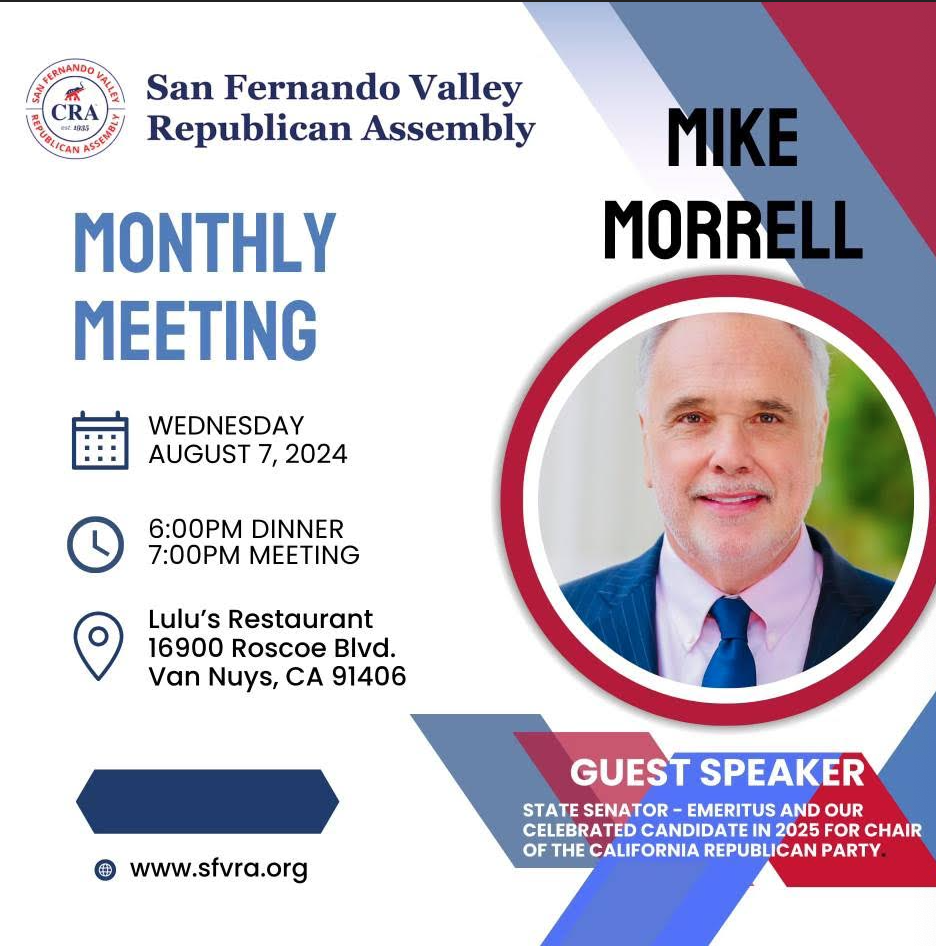 San Fernando Valley Republican Assembly Monthly Meeting Wednesday, August 7, 2024 3:00 PM 5:00 PM Google Calendar ICS Please join the San Fernando Valley Republican Assembly at their monthly meeting. Guest speaker, Senator Mike Morrell, will be joining. For more information visit the link below. Learn more