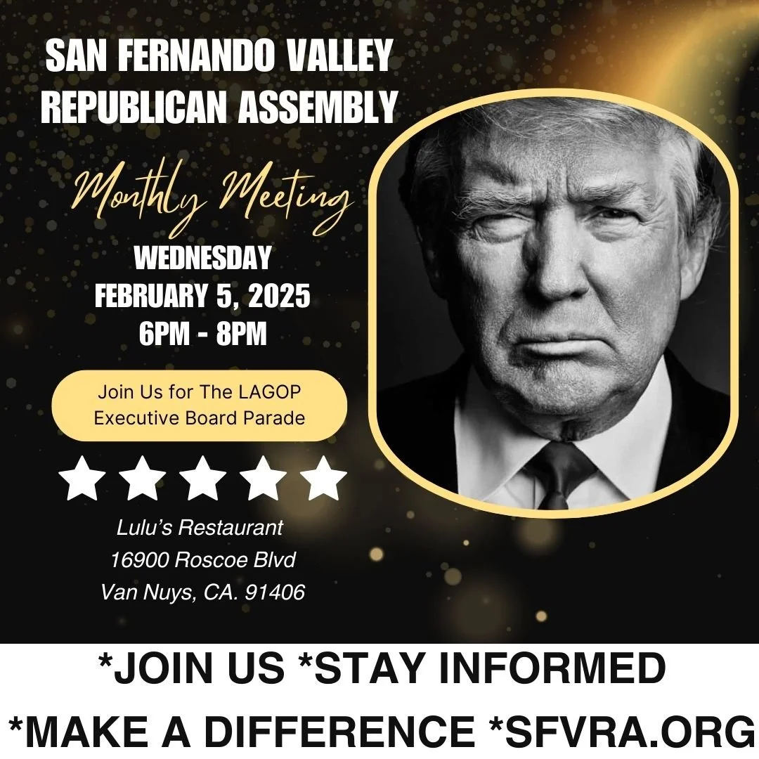 San Fernando Republican Assembly Wednesday, February 5, 2025 3:05 PM 5:00 PM Lulu's Restaurant 16900 Roscoe Boulevard Los Angeles, CA, 91406 United States (map) Google Calendar ICS