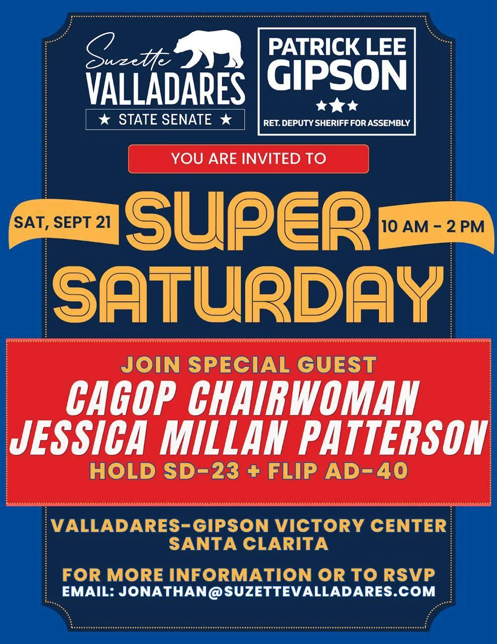 Super Saturday with CAGOP Chairwoman Jessica Millan Patterson Saturday, September 21, 2024 7:00 AM 11:00 AM Google Calendar ICS