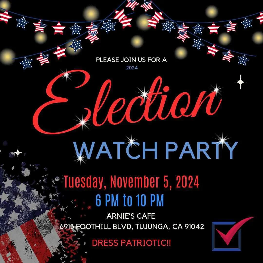 Tujunga Election Watch Party Tuesday, November 5, 2024 3:00 PM 7:00 PM Arnie's Cafe 6913 Foothill Boulevard Los Angeles, CA, 91042 United States (map) Google Calendar ICS