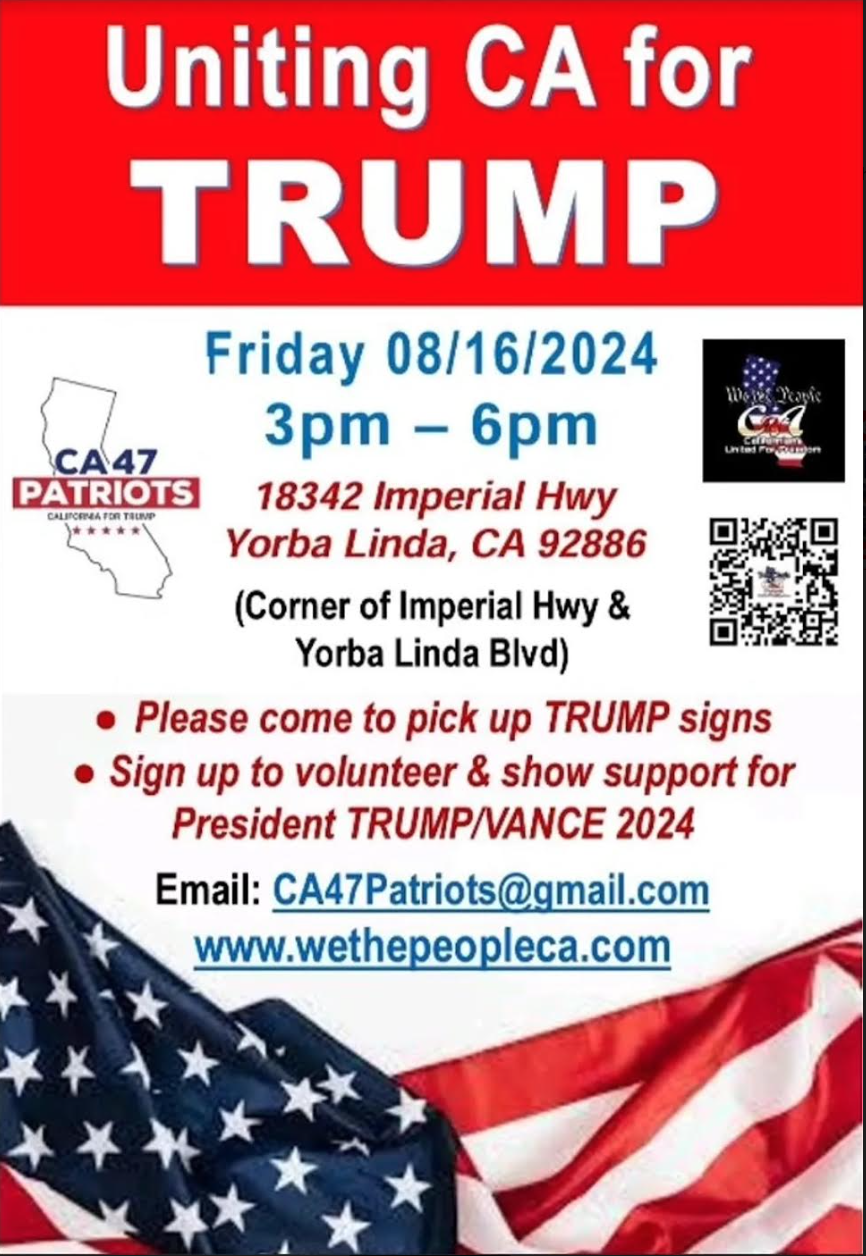 Join CA 47 Patriots in their Uniting for Trump event. Come pick up TRUMP signs and volunteer to show your support for President Trump/Vance 2024.
